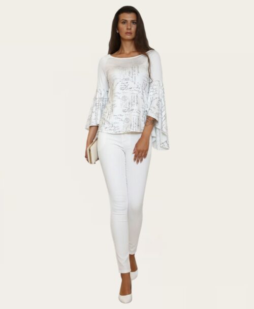 This chic design tunic features an open shoulder asymmetrical design with a beaded trim strap. This top is a show-stopper at any special event!